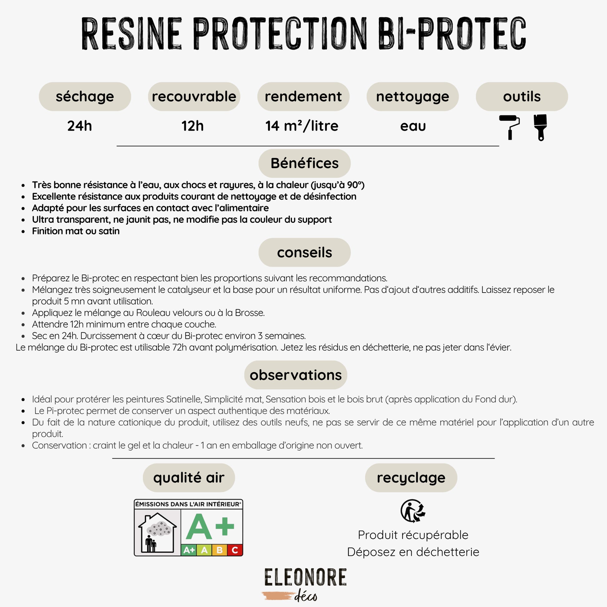 Vernis Bi-protec transparent de très haute qualité et non jaunissant. Très bonne résistance à l'eau, bonne résistance aux chocs et rayures, excellente résistance aux produits courants de nettoyage et de désinfection. Idéal pour les ambiances alimentaires. Excellente tenue à la chaleur (90°). Vernis de finition et de protection pour la gamme Eléonore Déco. Le Bi-protec permet de conserver un aspect authentique des matériaux. Rendement : 7m2 pour 500ml.