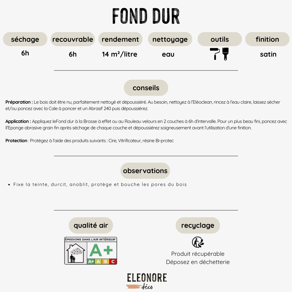 Le Fond Dur s'applique en 2 couches à 6h d'intervalle, sur bois brut ou teinté avec l'une de nos Teintes bois. Entre chaque couche, égrainez légèrement pour avoir un bois parfaitement lisse et doux au toucher. Appliquez ensuite un vernis, soit notre Vitrificateur pro, soit notre Bi-protec pour une protection plus intense.