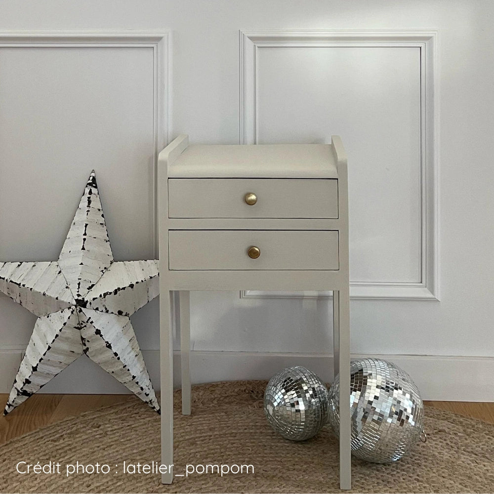 Peinture pour meuble Soie Sauvage d’Éléonore Déco : une merveille de beige grisé, ultra doux et bien chaud, juste une pointe plus claire que Lin. Véritable valeur sûre, elle incarne le bon goût et offre une présence discrète et élégante, idéale pour créer des ambiances apaisantes et raffinées.